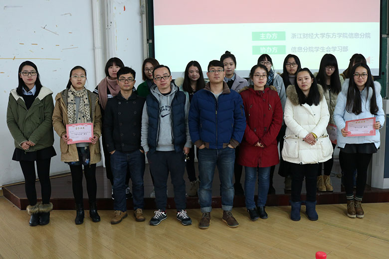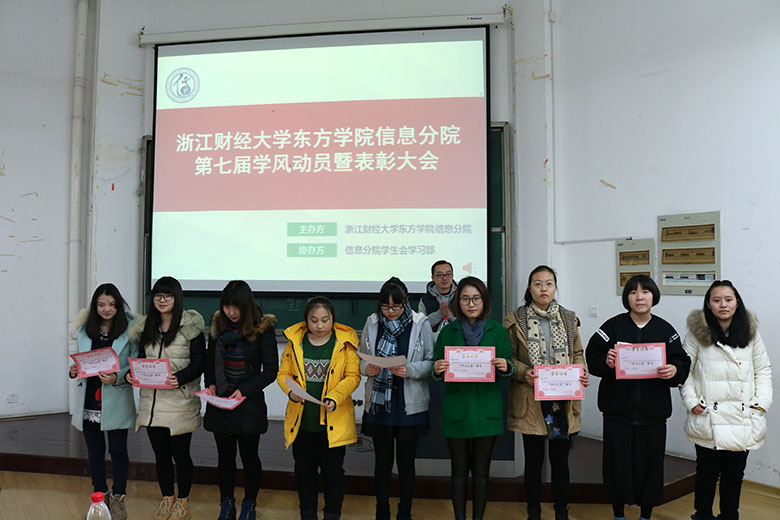 2015年12月21日下午 ,浙江财经大学东方学院信息分院第七届学风动员暨表彰大会在5J-101隆重举行。会议由团总支书记王普老师主持,分院辅导员赵苑、王江珏老师,青年教师洪倩茹、耿海和各班级代表参加了本次会议。