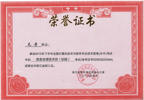 近日,2015年下半年计算机技术与软件专业技术资格(下文简称软考)合格证书颁发,2015年全国软考正式完成。2015年上半年我院共报名参考人数165人,合格人数78人,下半年报名参考人数117人,合格人数51人,通过率分别为47.27%和43.59%,均高于全省平均通过水平28.29%、31.03%。信息分院12信息2班毛丹同学还荣获2015年下半年全国软考“信息处理技术员”考试成绩浙江省前三名的佳绩。