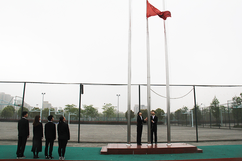 7时整,升旗仪式在凉风和细雨中准时开始。英姿飒爽的国旗护卫队护送五星红旗入场,伴随着庄严的《中华人民共和国国歌》,全体师生行注目礼,五星红旗冉冉升起。