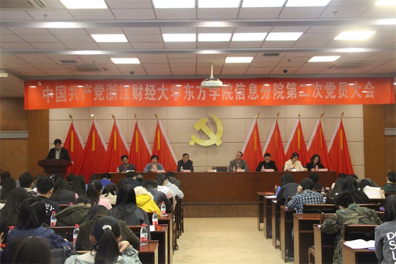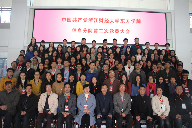 11月22日中国共产党浙江财经大学东方学院信息分院第二次党员代表大会在行政楼隆重开幕。教职工正式党员,学生正式党员,学生预备党员代表,党员代表大会特邀代表及列席代表共104人参会。大会由党总支副书记王晓玲主持。