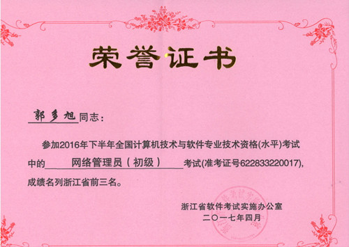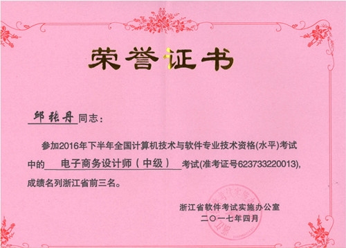 近日,从浙江省软考办传来喜讯,信息分院学子在2016年下半年全国计算机技术与软件专业技术资格(水平)考试(简称软考)中再创佳绩,我院共177人报考,108人通过考试,通过率远远高于全省软考平均通过率。其中,14电商2班邱张丹在"电子商务师(中级)"考试中成绩名列浙江省前三名,13市场营销2班郭多旭在"网络管理员(初级)"考试中成绩名列浙江省前三名。