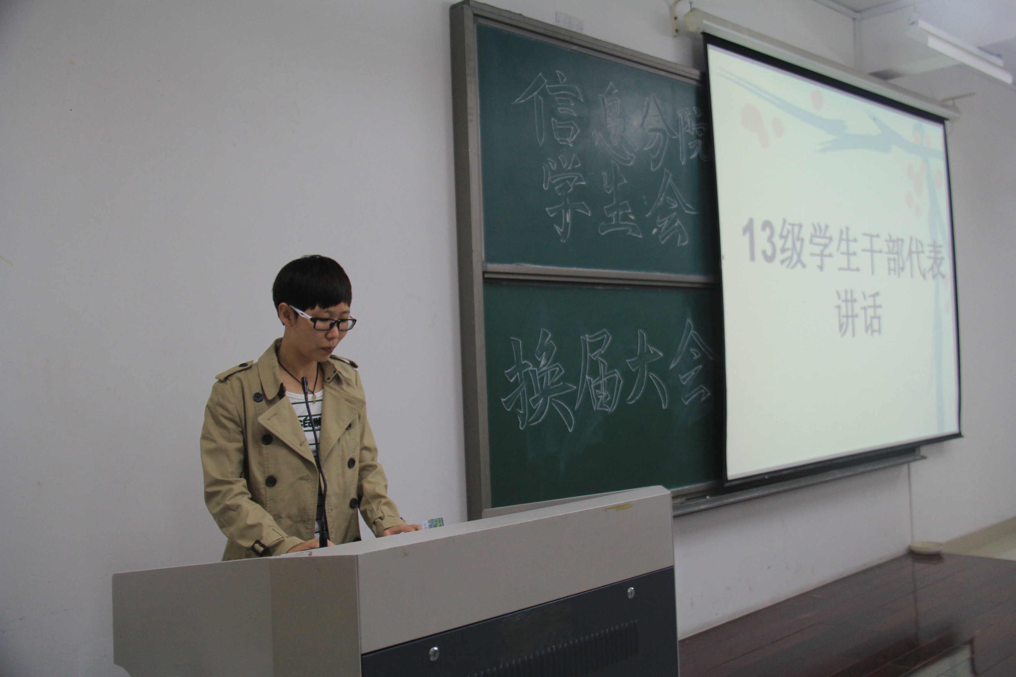 会议第二项,13级学生会主要干部代表发言。13级执行副主席林娟娟同学讲述了她在学生会度过的充实快乐的三年,带给同学们很多的感受和感情。