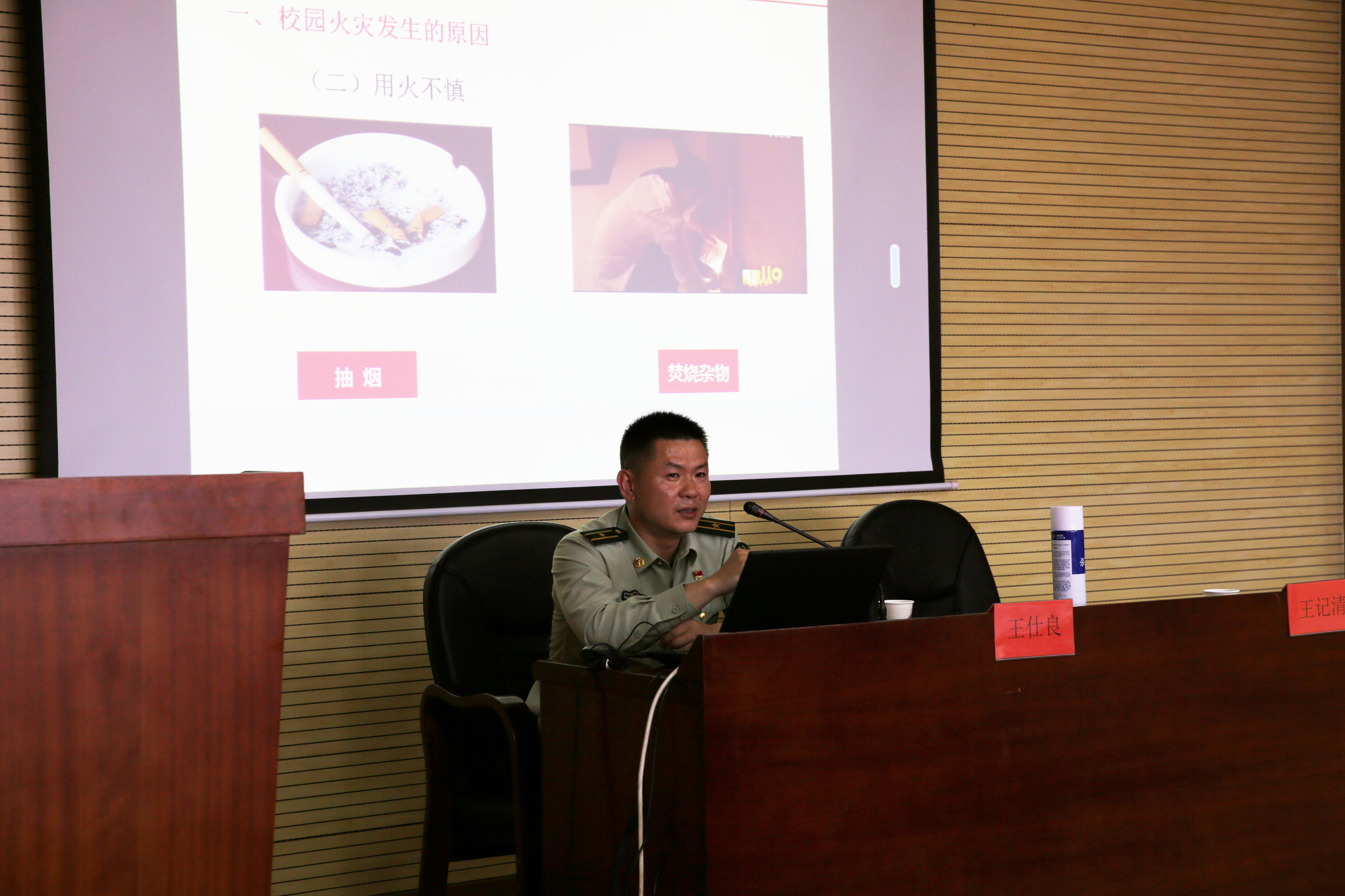 标准的敬礼、响亮的口号,王教导员以“战士”的身份开篇介绍自己,赢得同学们的阵阵掌声,校园安全讲座正式开始。首先,王教导员通过播放高校火灾视频,讲述身边的例子,让同学们产生了高度的共鸣。紧接着,他根据视频举例说明校园发生火灾的原因,并借此提醒同学们要积极做好校园防范工作。随之,他也介绍了火灾事故的几种类型和应对措施,在座的同学们都深刻认识到生活中的一些小细节都有可能酿成大祸。与此同时,王教导员还讲述了许多火灾实例,分析了各个原因,并指出,大学生应该要掌握基本火灾的扑救方法,应该理性冷静的发现火灾问题,面对火灾问题,解决火灾问题。从防范到应对,从应对到报警,从报警到最后火灾现场的补救措施,参与讲座的师生受益匪浅。