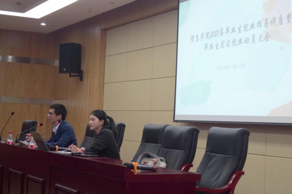 为帮助2021届毕业生了解毕业就业的时间安排,提高就业意识,认清就业形势,把握就业机会,推动就业工作稳步前进,2020年11月17日上午九点半,在学术中心二号报告厅举行了我院2021届毕业生就业动员大会,大会特邀信息学院党总支书记费松天老师、17级毕业班辅导员豆芹兰老师出席,全体2021届毕业生同学参会。