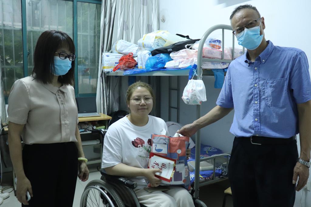 拜访的第一位新生同学,有一点点特别,她是一个很勇敢又坚强的小朋友,因为一些身体原因,需要家人的陪护,学院得知这一情况,积极进行各方沟通协调,尽心解决其生活住宿困难,学院领导和老师也给予了其最大的关怀和帮助。我们现场走访的老师们也送出了自己最诚挚的祝贺,林香娥书记和成定平院长也为这位乐观坚强的新同学送出了学院的一份心意,希望在未来的日子里,我们的同学们互相帮助互相学习,迎来我们崭新的大学四年!相信在大家的关怀之下,她一定会自信又耀眼的展翅翱翔在大学这片蓝天中。