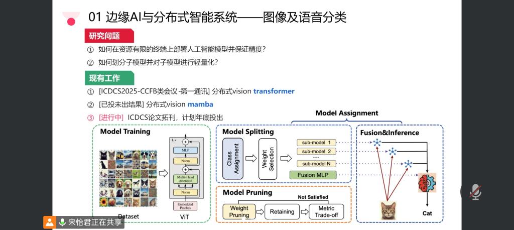 宋老师重点介绍了其在多模态边缘AI与分布式智能系统研究的最新进展。针对资源受限终端的AI部署难题,她创新提出"任务拆分子模型+轻量化处理+融合整合"的技术路径,相关研究已覆盖CNN、SNN等主流架构,形成包含已投稿成果及持续拓展项目的阶段性进展。在多模态弱监督学习方向,她聚焦无强标签场景下的训练框架设计,通过视觉与文本模态融合技术,为视频检索、图像分割等任务提供解决方案,并特别指出该方向与边缘AI研究的协同潜力。