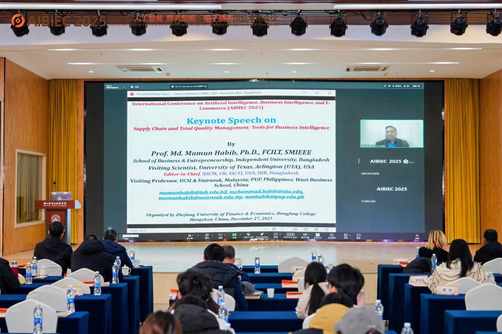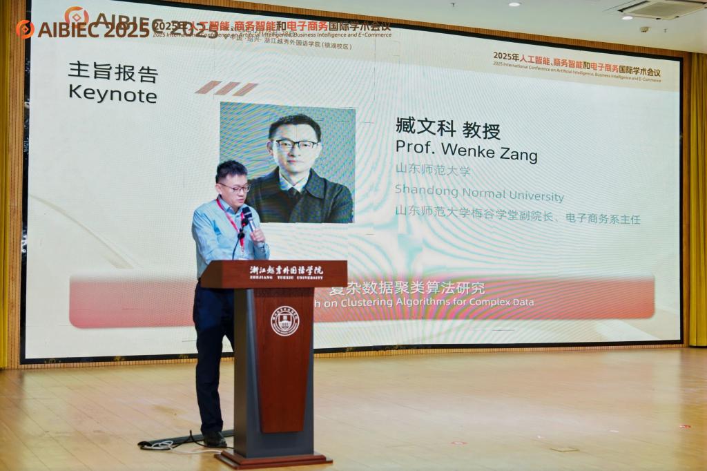 12月27至28日,由浙江越秀外国语学院、浙江财经大学东方学院联合主办的2025年人工智能、商业智能与电子商务国际会议(AIBICE2025)在绍兴成功举办。浙江大学张子柯教授、山东师范大学臧文科教授、浙江工业大学孔祥杰教授、南京财经大学张庆民副教授、孟加拉国独立大学 Md. Mamun Habib 教授等海内外专家学者受邀出席。来自中国农业大学、中国计量大学、上海外国语大学、浙江外国语学院等全国多所高校的专家学者、青年教师、学生等齐聚一堂,共话商务智能领域前沿创新与实践应用。