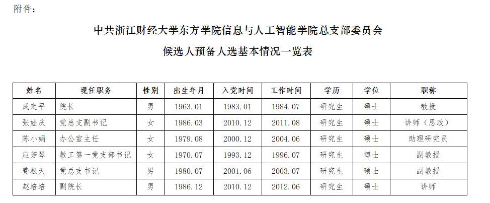 附件:中共浙江财经大学东方学院信息与人工智能学院总支部委员会候选人预备人选基本情况一览表