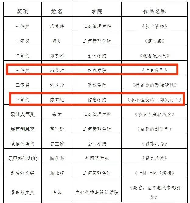 “清廉就在我身边”廉洁故事、廉洁散文征文大赛评奖结果公示如下。我院学子积极参与“清廉就在我身边”廉洁故事、廉洁散文征文大赛 , 21电商2班韩英才 《“青莲”》、20互金1班陈安妮《永不湮没的“郑义门”》获得院级三等奖。